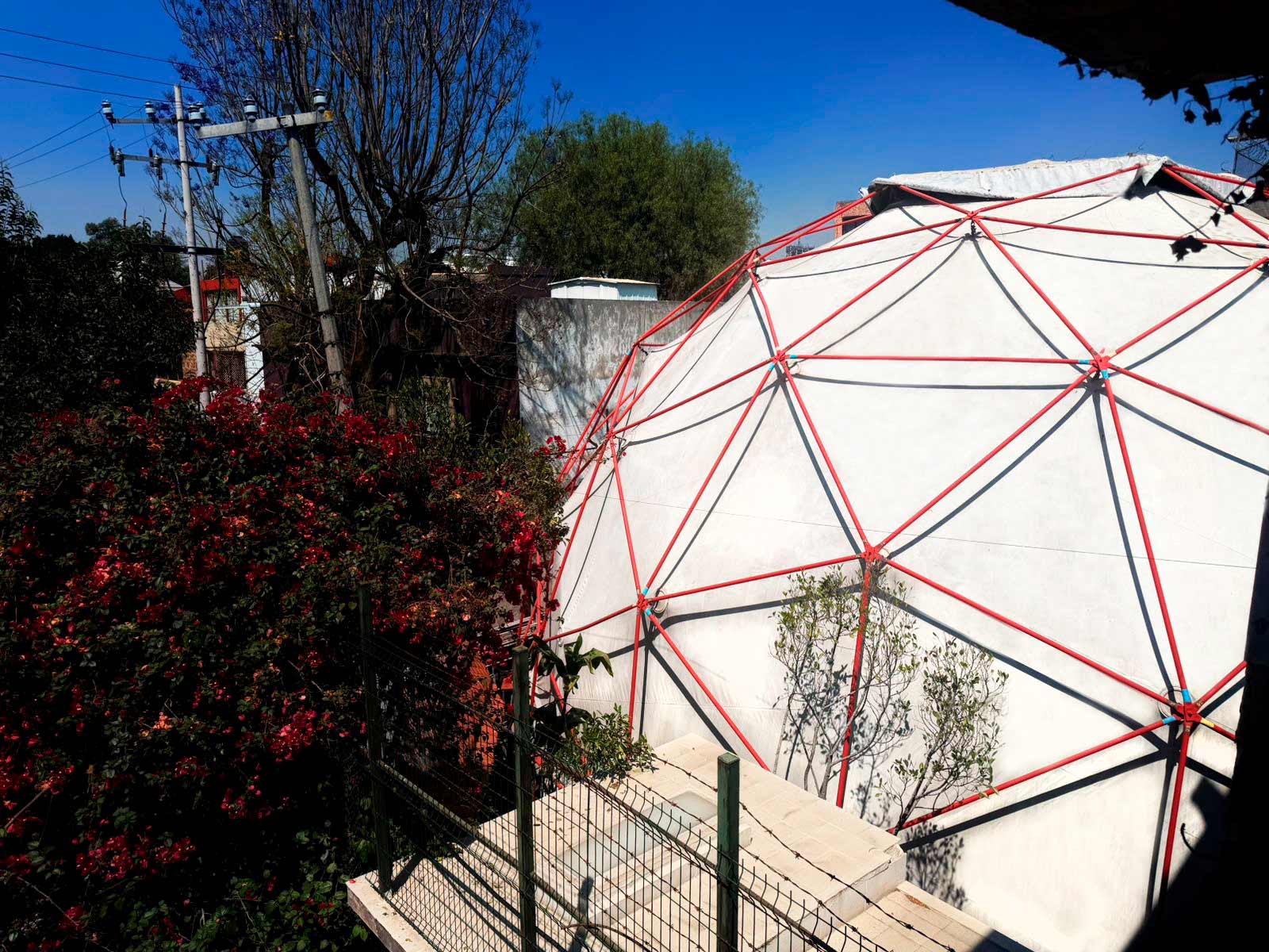 La forma general es la de una cúpula geodésica, es decir, un domo compuesto por piezas triangulares que se conectan para distribuir las cargas de forma eficiente sin necesidad de columnas interiores. Según descripciones históricas, la estructura original en San Ángel tenía aproximadamente 15 metros de diámetro y estaba formada por unos 365 postes conectados en forma de red geométrica. En resumen, la Carpa Geodésica de San Ángel no es una carpa tradicional, sino una cúpula geodésica estructuralmente eficiente y visualmente distintiva que funciona como teatro y espacio cultural, aprovechando su diseño para ofrecer un amplio interior cubierto sin columnas y una estética singular.